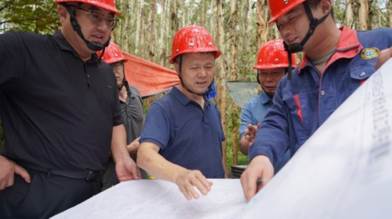 黎四龍(前中)詳細(xì)了解平果地區(qū)的鋁土礦分布情況 黎四龍(右三)與技術(shù)人員一起分析鉛鋅礦品位情況 …