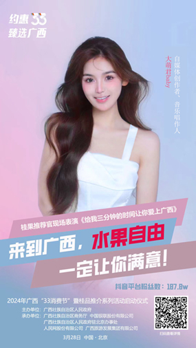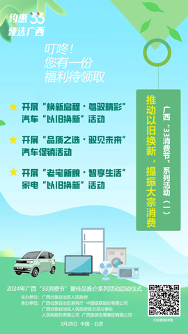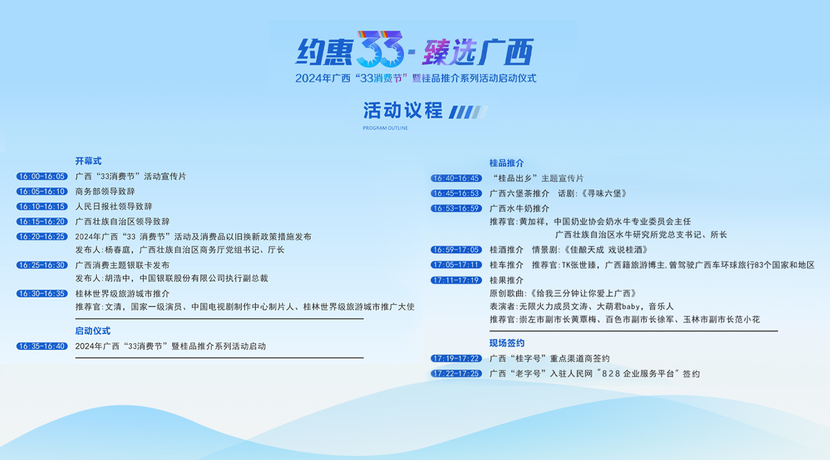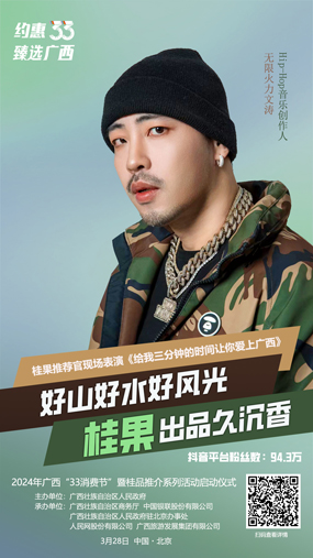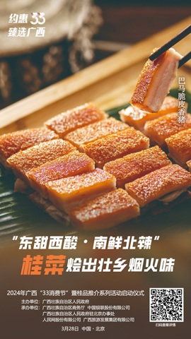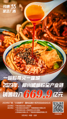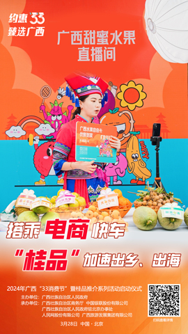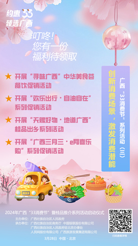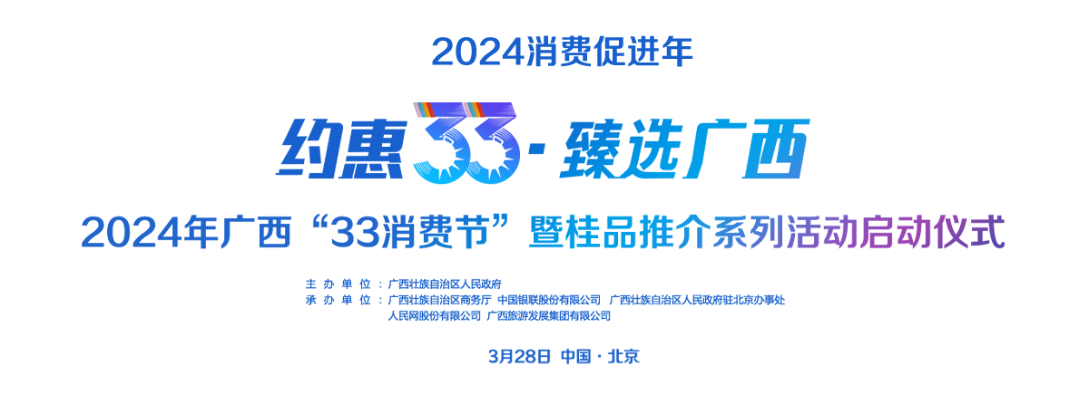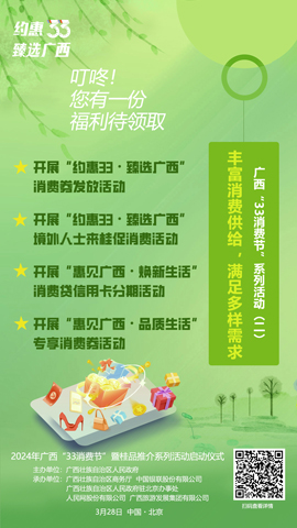 約惠33·臻選廣西。3月28日,由廣西壯族自治區(qū)人民政府主辦,廣西壯族自治區(qū)商務(wù)廳、中國銀聯(lián)股份有限公司、廣西壯族自治區(qū)人民政府駐北京辦事處、人民網(wǎng)股份有限公司、廣西旅游發(fā)展集團(tuán)有限公司承辦的2024年廣西“33消費(fèi)節(jié)”暨桂品推介系列活動(dòng)啟動(dòng)儀式在北京·人民網(wǎng)一號(hào)演播廳舉行。本次活動(dòng)采取線上+線下的形式同步進(jìn)行,旨在通過一系列精彩紛呈的推介活動(dòng),將廣西的優(yōu)質(zhì)產(chǎn)品介紹給全國乃至全世界的消費(fèi)者。