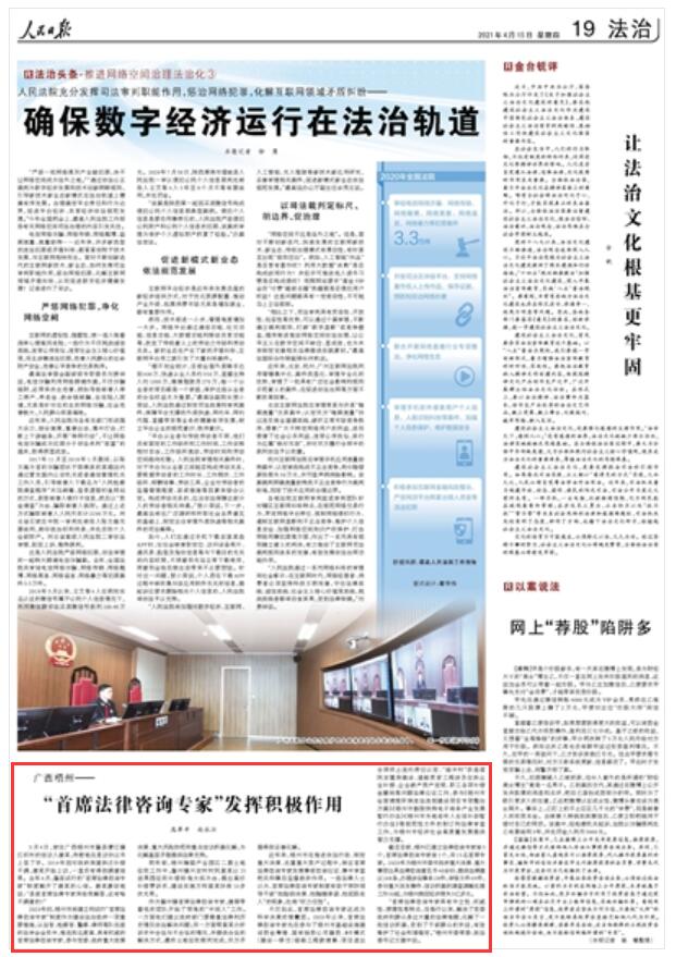 “首席法律咨詢專家具有中立性、權(quán)威性、便捷性等特點(diǎn),自推行以來,解決了黨委政府和群眾身邊大量的法律難題,化解了一批信訪積案,受到了干部群眾的歡迎,有效維護(hù)了社會(huì)和諧穩(wěn)定。”梧州市委常委、政法委書記文建中說。(龐革平、尚永江)