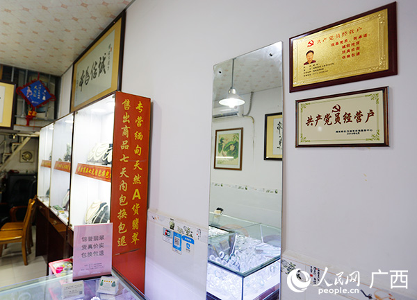 玉林市古玩城個體經(jīng)營戶陳任的店鋪掛著黨員經(jīng)營戶的牌子。人民網(wǎng) 彭遠(yuǎn)賀攝