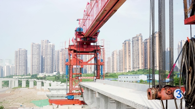 該工程所經(jīng)地區(qū)地質(zhì)、地形條件復(fù)雜,高架及下穿地段多,多處跨城區(qū)道路,同時涉既有線施工,施工難度大,技術(shù)要求高。為滿足施工工藝要求和工期進度,南寧鐵路工程建設(shè)指揮部組織施工單位中鐵五局優(yōu)化施工組織設(shè)計,制定重難點工程、工序?qū)m検┕し桨,確保各項施工有序推進。在當前的鳳嶺特大橋架梁施工中,他們引入國內(nèi)先進的JQJ180公鐵兩用架橋機,采取“先架后鋪”的方式進行施工,鋪軌則采用人工配合小型機械進行作業(yè),有效提高施工效率。