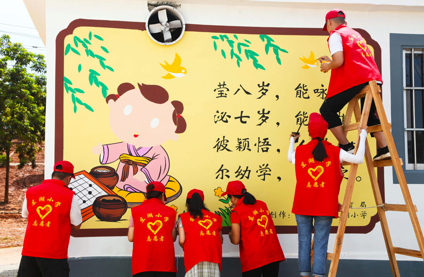 志愿者頭頂烈日進(jìn)行墻體繪制。