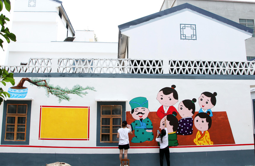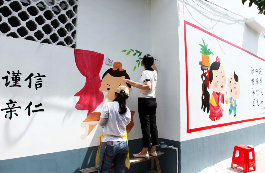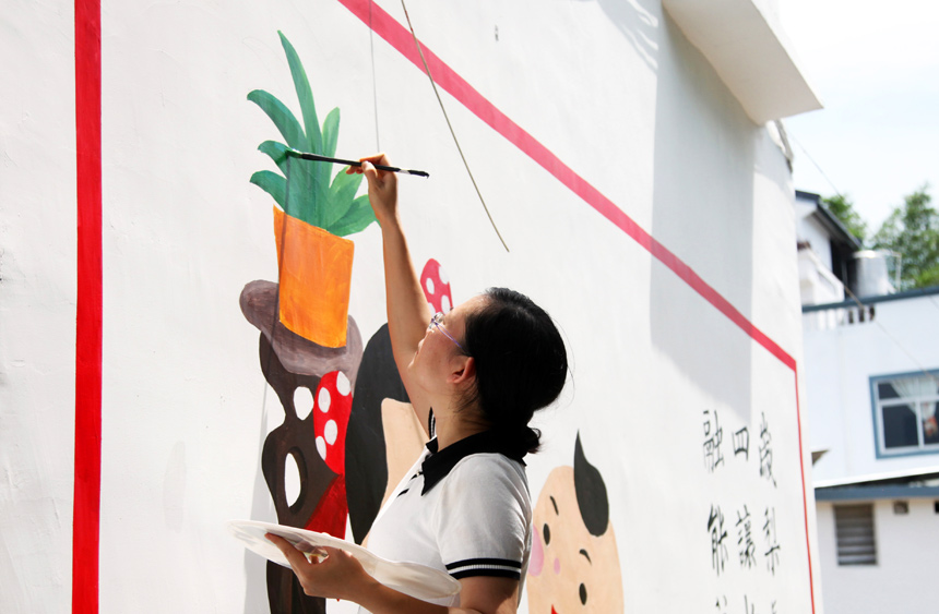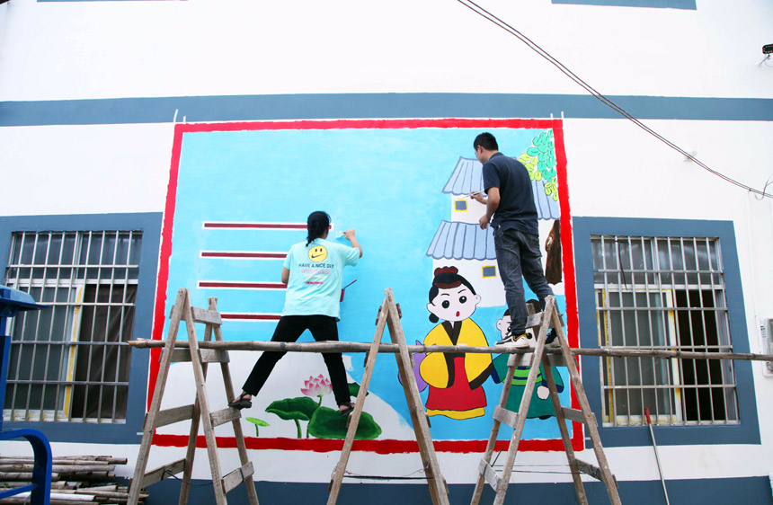 老師們頂著烈日進(jìn)行墻體彩繪。