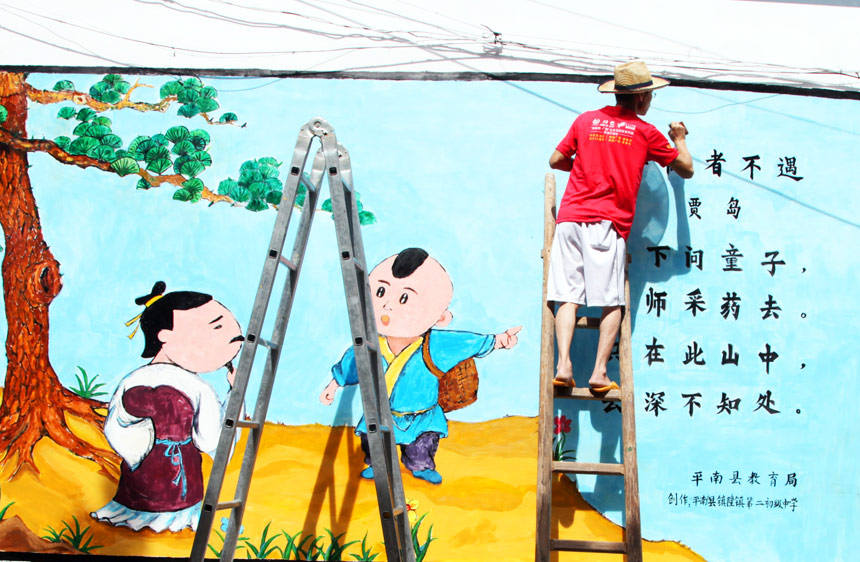 為提升鄉(xiāng)村振興之“魂”,助力鄉(xiāng)村振興,平南縣教育局在鎮(zhèn)隆鎮(zhèn)石嶺村樟嶺屯打造“詩香鄉(xiāng)村”及“中國傳統(tǒng)文化經(jīng)典示范點”,通過詩配畫的形式,將唐詩、宋詞、三字經(jīng)等經(jīng)典文學(xué)作品和社會主義核心價值觀“搬”到墻上,打造“一村一主題,一戶一詩一畫不重復(fù),詩畫融合”的經(jīng)典墻繪作品,讓優(yōu)秀傳統(tǒng)文化知識元素變得好看、好學(xué)、好懂,使宣傳教育與美化環(huán)境有效融合,達(dá)到“潤物細(xì)無聲”的效果。7月16日以來,該縣22所學(xué)校的100多名藝術(shù)教師在各校校長的帶領(lǐng)下,對樟嶺屯內(nèi)的60多戶農(nóng)家外墻進(jìn)行繪制。