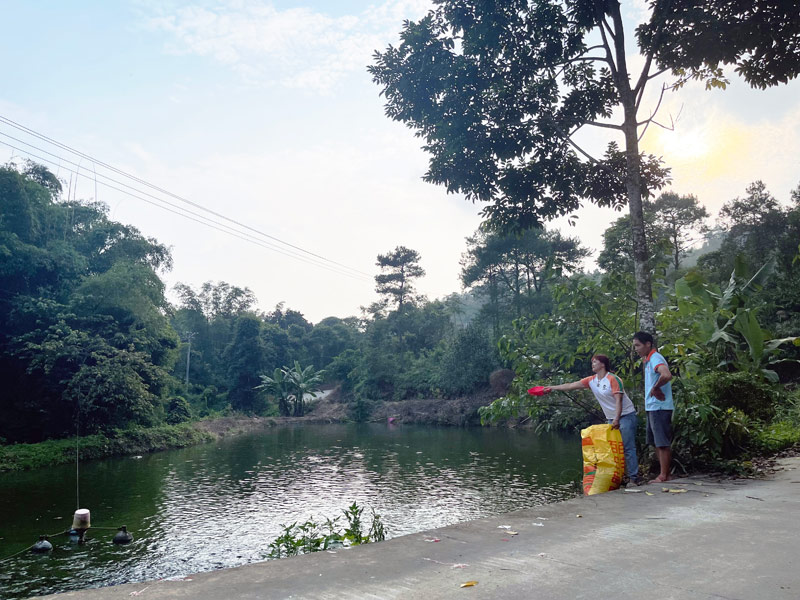 梁永剛夫婦在魚塘邊喂魚。防城區(qū)融媒體中心供圖
