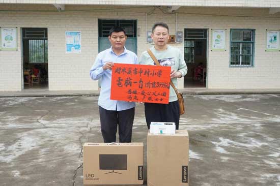 梁鴻代表愛(ài)心人士為大業(yè)鎮(zhèn)勝垌村中村小學(xué)捐贈(zèng)電腦。大業(yè)鎮(zhèn)政府供圖