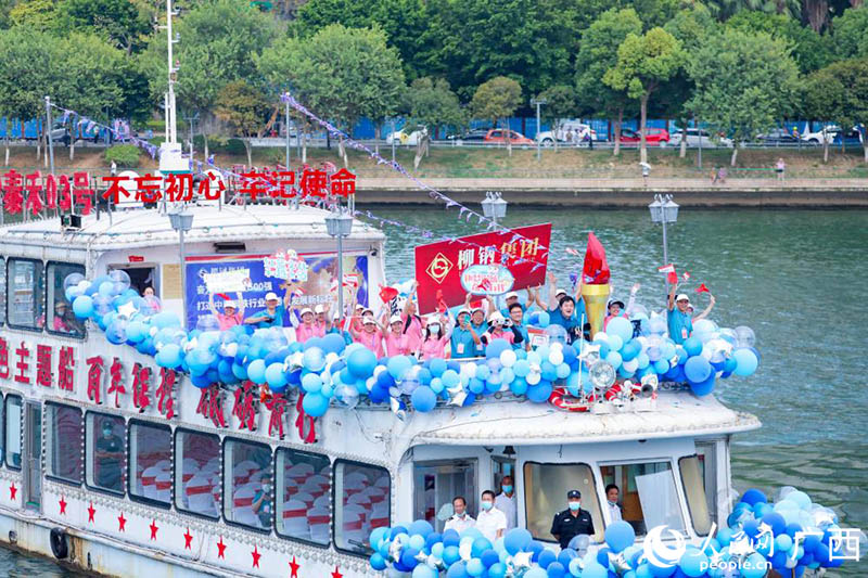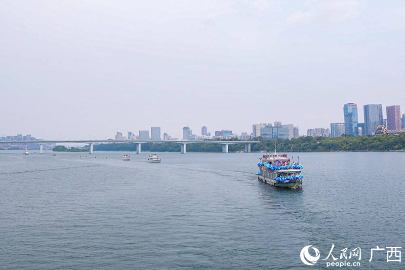 開幕式巡游船艇編隊(duì)在柳江上航行。人民網(wǎng) 吳明江攝