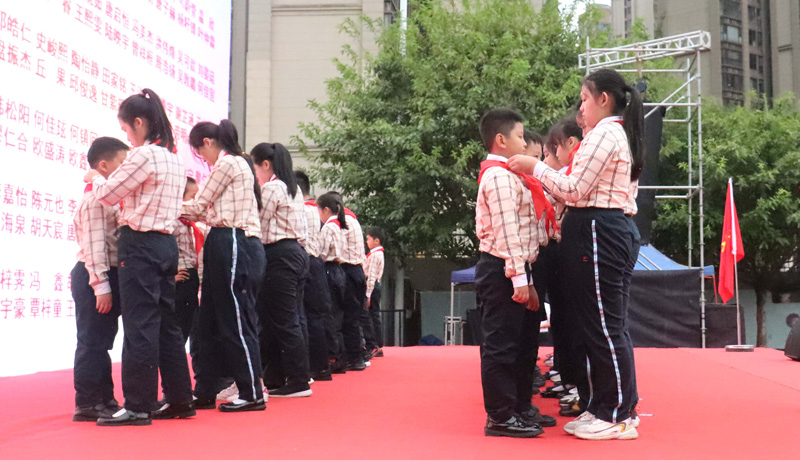 本次活動的主題為“紅領(lǐng)巾心向黨 爭做新時(shí)代好隊(duì)員”;顫姷拈_場舞《紅領(lǐng)巾飄起來》之后,伴隨著悠揚(yáng)的國歌,少先隊(duì)員們敬隊(duì)禮,注視國旗冉冉升起。在這個(gè)莊重的場合,234名同學(xué)光榮加入中國少年先鋒隊(duì),新隊(duì)員接受來自高年級隊(duì)員的授巾,稚嫩的臉龐上都是一派認(rèn)真嚴(yán)肅,并面向隊(duì)旗進(jìn)行莊嚴(yán)宣誓。新一屆大隊(duì)委也在今天接受臂章,開展新一屆工作。