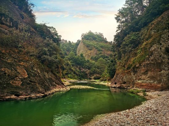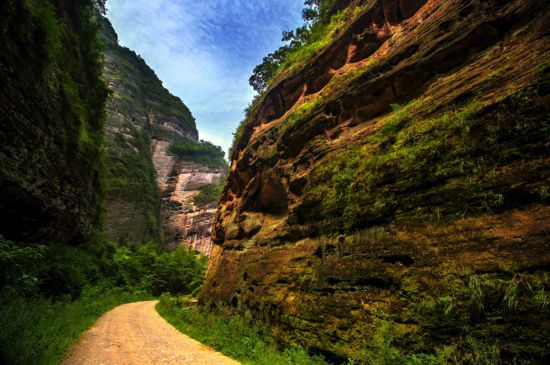 群峰林立的八角寨丹霞地貌,營造了縱橫交錯的眾多深溝峽谷,穿行于林莽竹深的原始峽谷,丹山壁立,小溪潺潺,四野空寂,天高云淡,迷宮似的峽谷給人無限遐想......