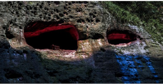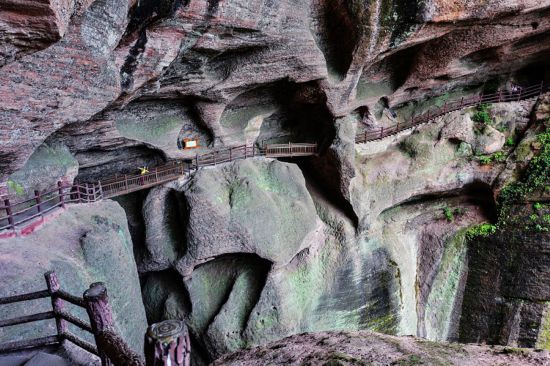 國家一級保護地質遺跡,大型蜂窩狀洞穴。棧道之下,絕壁幽深,谷底薄霧宛同玉帶飄蕩,鴉唉雀吠,若獨處此地,就會感到異常的靜謐駭寒,毛骨悚然。