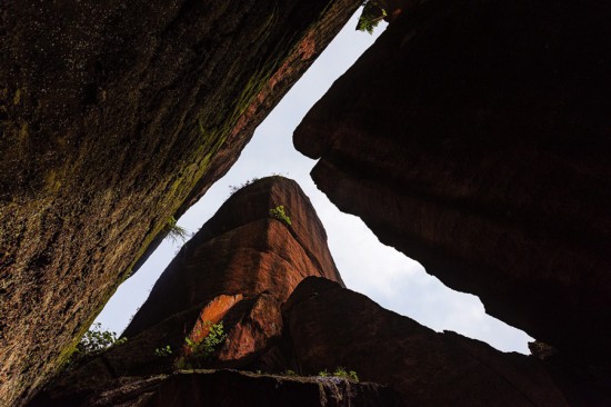 在這道窄窄的石縫中部的上方,由里側一堵懸石和外側兩塊分立的巨石形成一個“T”字形結構,抬頭向上看,那條直的石縫與橫的石縫連接,形成一個巨大的“人”字!叭恕弊种,藍天白云,浩瀚宇宙,恰好契合了道家“天人合一”的觀點。