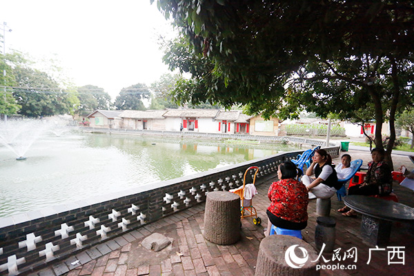新圩村司馬第的村民在噴泉池塘邊上休閑、拉家常。人民網(wǎng) 彭遠(yuǎn)賀攝