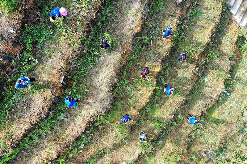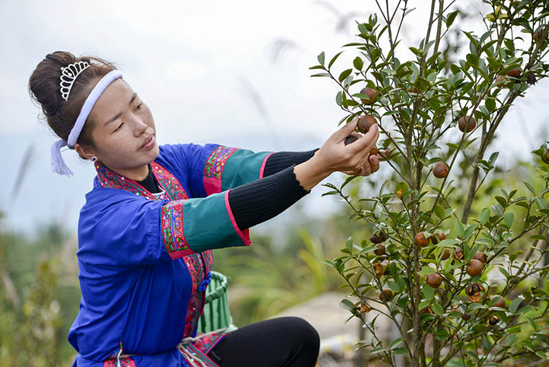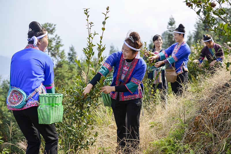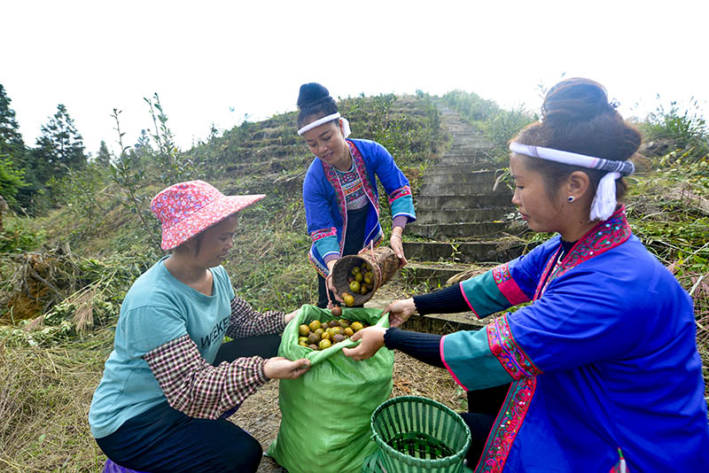 人民網(wǎng)三江11月8日電 時(shí)下正值油茶采收季,在三江侗族自治縣洋溪鄉(xiāng)紅巖村,村里種植的高效優(yōu)質(zhì)油茶迎來了豐收,種植戶們正緊抓晴好天氣采收油茶果。
