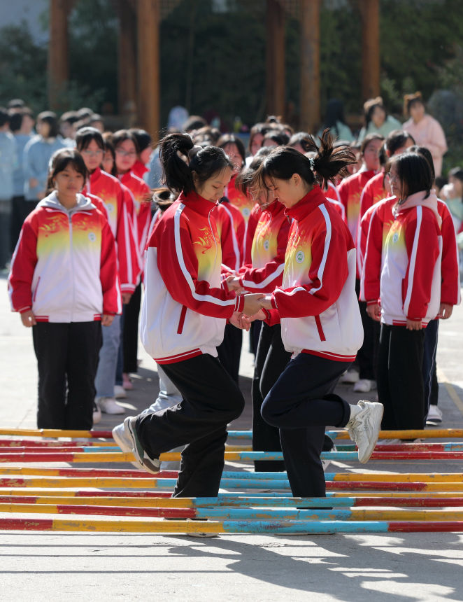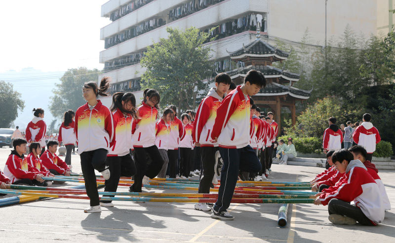 學(xué)生們正在比賽竹竿舞。龔普康攝