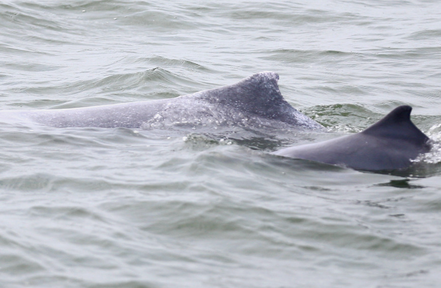 近日,廣西欽州的攝影愛好者跟隨北部灣中華白海豚研究保護團隊乘船出海,在欽州三娘灣海域偶遇幾頭中華白海豚,其中的白海豚幼崽正是今年7月新出生的“小開開”。它的皮膚黝黑光滑,緊跟著海豚媽媽在海里游玩。