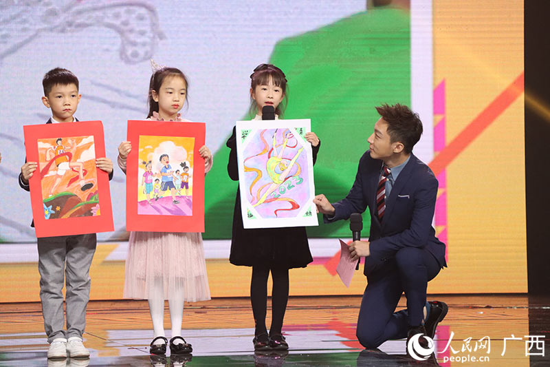 孩子們登臺(tái)展示自己創(chuàng)作的迎學(xué)青會(huì)主題繪畫作品。人民網(wǎng) 吳明江攝