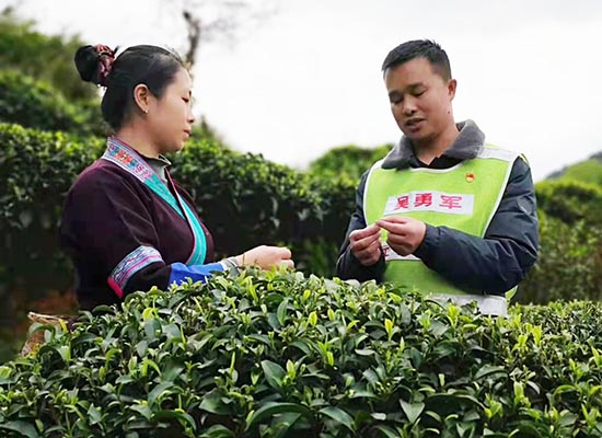 柳州煙草局派駐工作隊(duì)員吳勇軍指導(dǎo)幫扶對(duì)象做好茶葉種植工作。曾劍鋒攝