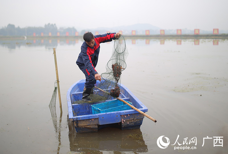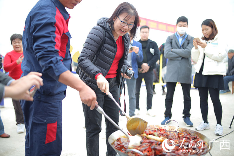 人民網(wǎng)桂平12月15日電 (沈泉池、吳明江)“吃小龍蝦不用跑外邊賣了,家門口就養(yǎng)有!12月15日上午,廣西貴港桂平市石咀鎮(zhèn)旺龍村村民周石清一邊在蝦塘喂料一邊說。去年7月,在外打工多年的她從廣東回到家鄉(xiāng),在村口的小龍蝦基地上班!霸诩依锷习嗄苷疹櫪先诵『,收入也算下來和在外面差不多,非常方便!敝苁鍖议T口的這份工作十分滿意。