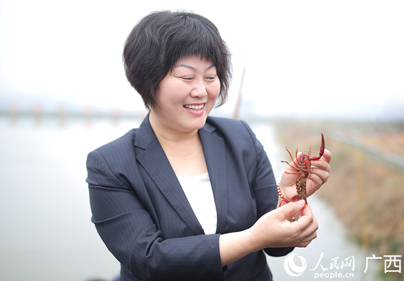企業(yè)負(fù)責(zé)人在展示當(dāng)?shù)仞B(yǎng)殖的小龍蝦。人民網(wǎng) 吳明江攝