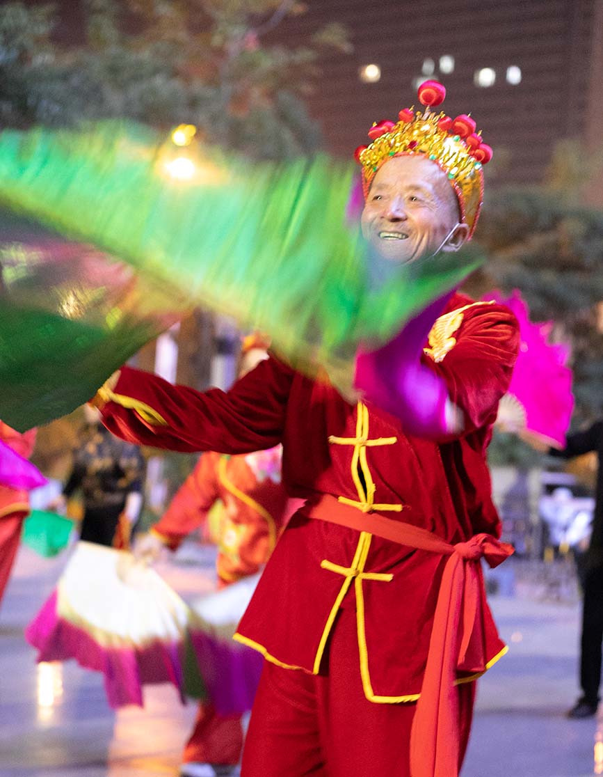 除了伏波文化公園,晚上8點鐘,白鷺公園、金地時代廣場等地的秧歌隊員們,也已經(jīng)開始扭動起來。