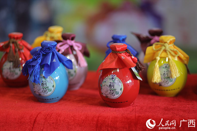 來自“世界茉莉花都”廣西橫州市的酒企利用當地農特產品釀制的茉莉花酒。人民網 吳明江攝