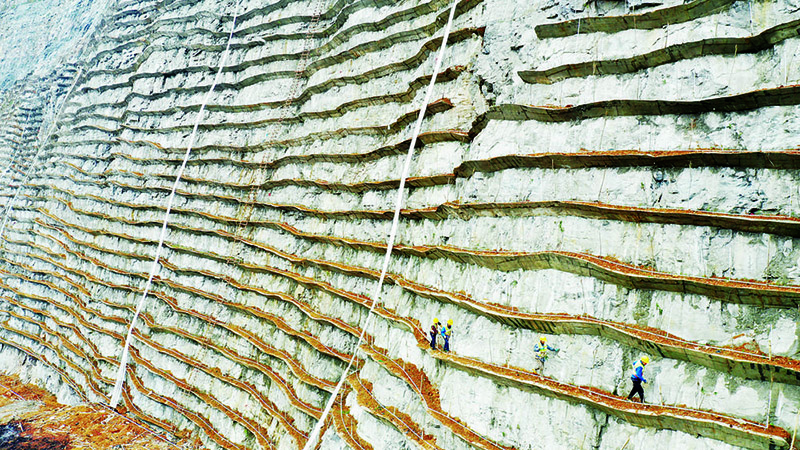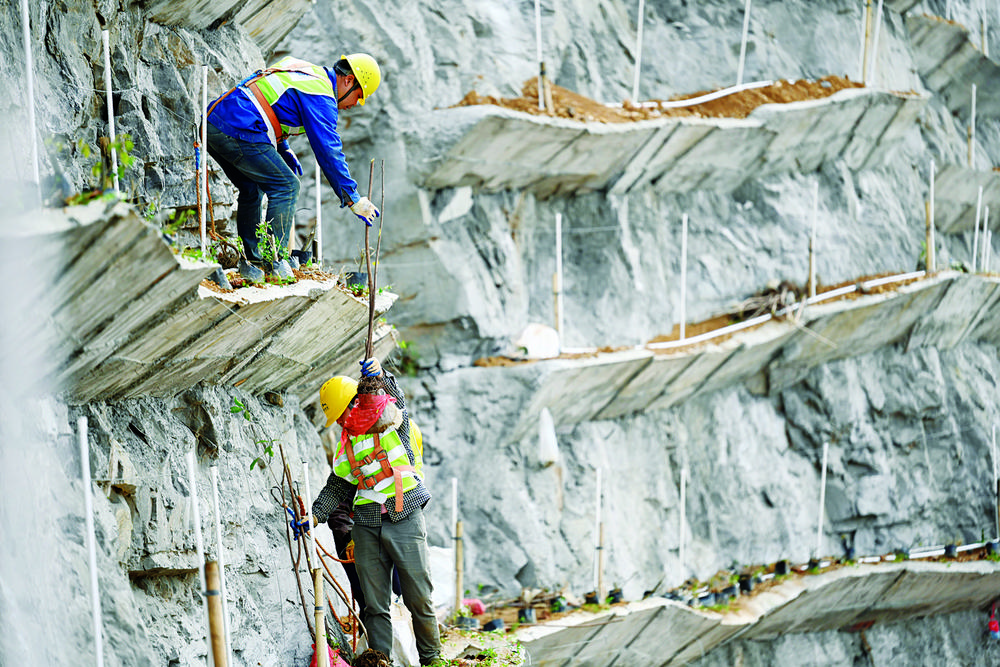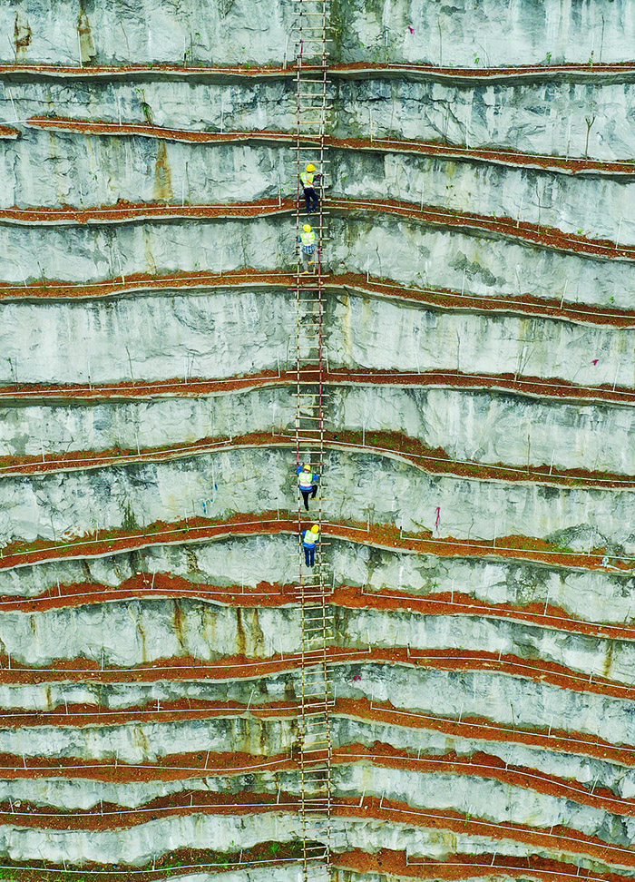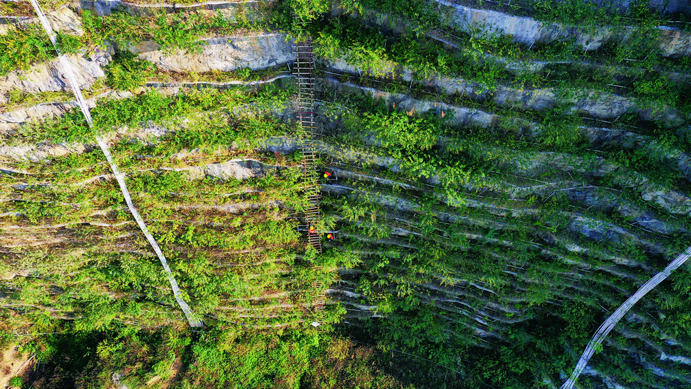 在工地上堅守多年的何定慶,回想整座大山的植綠過程依然感慨良多。他說:“為了確保施工安全,我們沿著山體向上,用鋼釘、鋼管等在峭壁上架設(shè)起100多米高的梯子,大家說這就是工人作業(yè)的‘天梯’;然后再繞著山體,用鋼絲繩在峭壁上拉起4萬多米長的安全繩,工人們說這是大家的‘生命線’!
