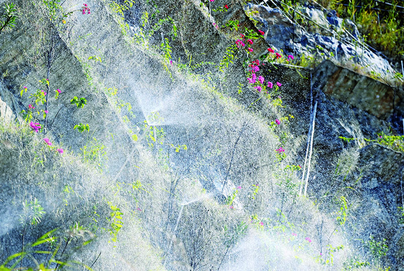 “我們已經(jīng)在山上種下了25萬多株各類苗木。”該項目經(jīng)理陳超宇說,工人們需要先清理有滾落危險的巖石,然后用鋼筋和混凝土在峭壁上搭建V型板槽,再給開辟出來的“梯田”回填泥土,并在“田間”鋪設(shè)噴淋系統(tǒng),最后才能進行種植。目前種植的苗木有石山紫薇、夾竹桃、石山榕、爬山虎、三角梅、杜鵑等。