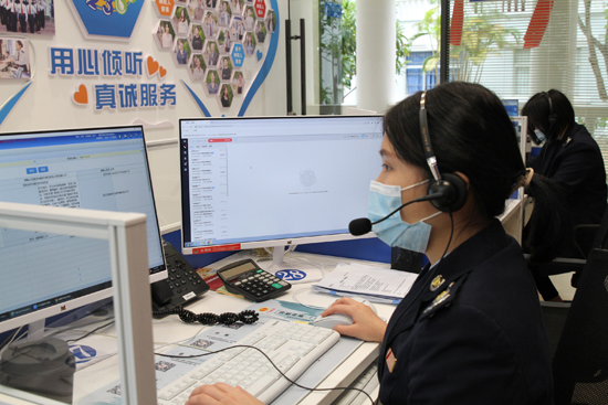 港口區(qū)稅務(wù)局12366工作人員在答復(fù)納稅人咨詢。港口區(qū)稅務(wù)局供圖