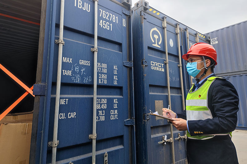 鐵路貨運員在對班列進行開箱檢查。劉雅琴攝