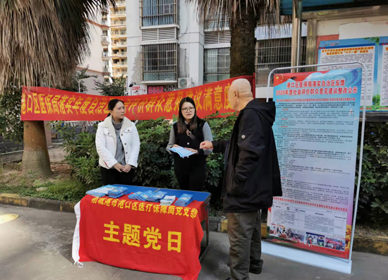 港口區(qū)醫(yī)保局到住宅小區(qū)開展“社會(huì)評(píng)價(jià)意見整改公示”以及醫(yī)保政策宣傳。港口區(qū)醫(yī)保局供圖