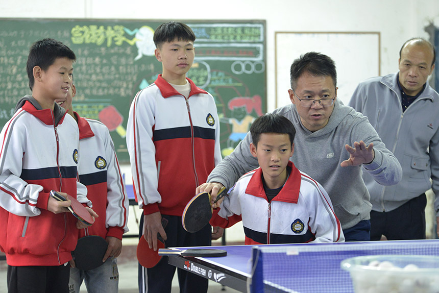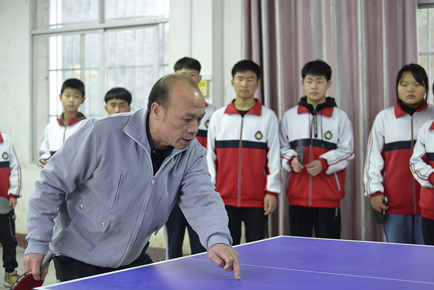 圖為支教民警指導(dǎo)孩子們練習(xí)發(fā)球。滾億忠攝