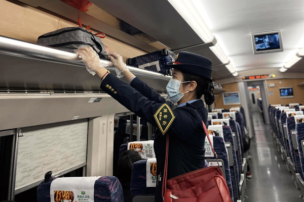 11時(shí)36分,列車緩緩駛出南寧東站。梁好啟動(dòng)“暴走”模式,巡視車廂、檢查廁所衛(wèi)生、整理行李架、核驗(yàn)車票、為旅客測(cè)溫、列車消毒等,她的身影不停地穿梭在8節(jié)車廂之間。