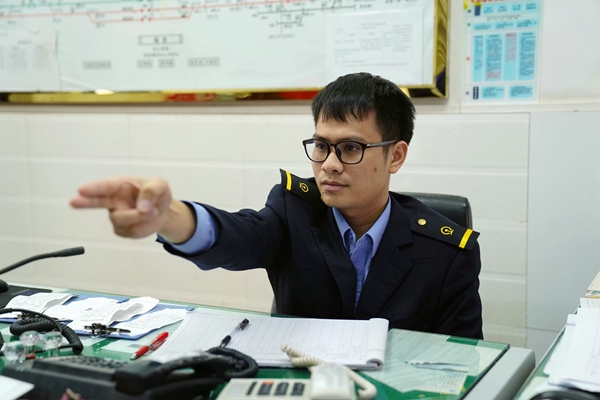 陳偉健是防城港站的一名車站值班員,他就像是車站里的“指揮官”,要與司機(jī)、列尾作業(yè)人員、外勤助理等各崗位人員進(jìn)行溝通,安排檢查機(jī)車狀態(tài)、組織調(diào)車、布置接發(fā)車和信號(hào)開(kāi)放等,保證列車有序進(jìn)出站。
