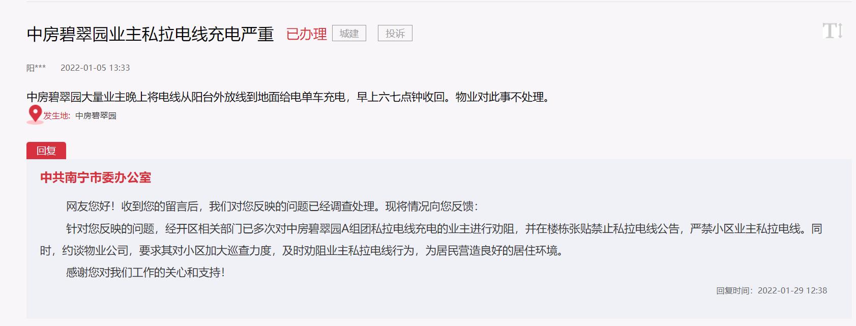 回復(fù)顯示,南寧市經(jīng)開區(qū)相關(guān)部門對(duì)網(wǎng)友反映的問題進(jìn)行了調(diào)查處理,多次對(duì)涉事小區(qū)私拉電線充電的業(yè)主進(jìn)行勸阻,并在樓棟張貼禁止私拉電線為電動(dòng)車充電的公告。同時(shí),約談物業(yè)公司,要求其對(duì)小區(qū)加大巡查力度,及時(shí)勸阻業(yè)主私拉電線行為,為居民營(yíng)造良好的居住環(huán)境。