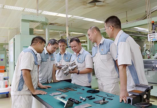 黨小組維修團隊在對設備零部件改進方案進行攻關討論。周振松攝