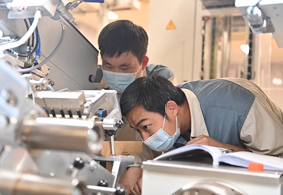 黨員鐘羽程(右)開展高速機設備保養(yǎng)要點的教學。周振松攝