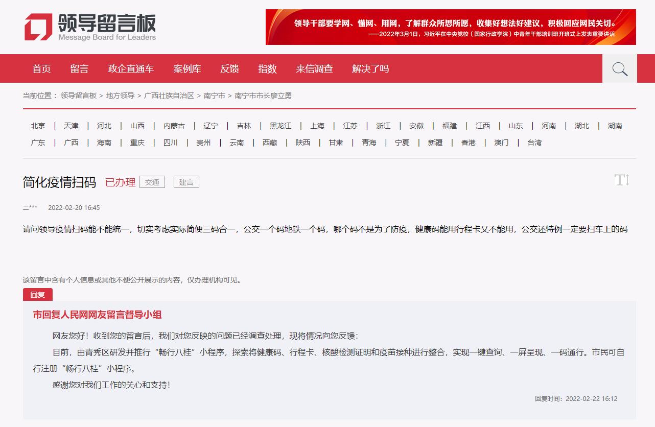經(jīng)過調(diào)查,南寧市回復(fù)人民網(wǎng)網(wǎng)友留言督導(dǎo)小組向留言群眾作出答復(fù)——由南寧市青秀區(qū)研發(fā)推行的“暢行八桂”小程序,將行程碼、健康碼、核酸檢測報告、疫苗接種等進行整合,實現(xiàn)一鍵查詢、一屏呈現(xiàn)、一碼通行。