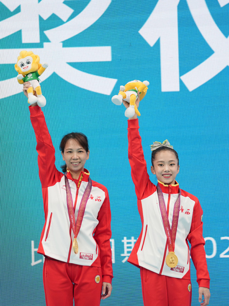 韋筱圓(右)獲得第十四屆全運會體操女子個人全能金牌,這是時隔56年后廣西女子體操隊再次獲得該項目冠軍。圖為韋筱圓與教練。廣西體育局供圖