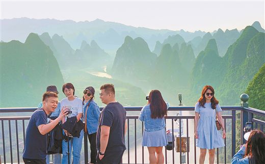 5月3日,游客在陽朔縣相公山景區(qū)觀賞漓江風情!拔逡弧毙¢L假期間,漓江秀美的風光吸引不少游客前來暢游。 黃勇丹/攝