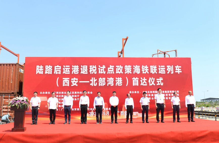 當(dāng)天,“陸路啟運(yùn)港退稅試點(diǎn)政策海鐵聯(lián)運(yùn)班列(西安—北部灣港)首達(dá)儀式”在廣西欽州市成功舉行,廣西壯族自治區(qū)發(fā)展改革委、廣西壯族自治區(qū)財(cái)政廳、廣西壯族自治區(qū)商務(wù)廳等有關(guān)單位負(fù)責(zé)同志及企業(yè)代表出席活動(dòng)。