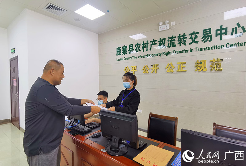 人民網(wǎng)南寧5月13日電 (付華周)“您好!請問您想要辦理什么業(yè)務呢?”近日,廣西柳州市鹿寨縣農(nóng)村產(chǎn)權(quán)流轉(zhuǎn)交易中心工作人員一邊引導來訪的廣西叁佰金農(nóng)牧有限公司總經(jīng)理龍輝就坐,一邊微笑著詢問。
