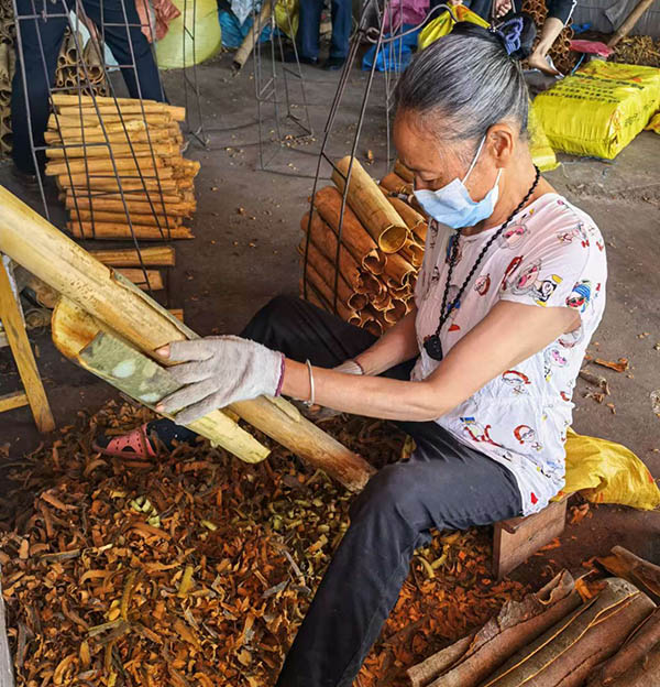 村民在肉桂加工作坊刨桂皮。唐善林攝