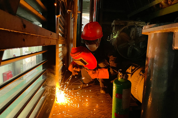 從車上下來后,還沒來得及脫下防護服喘口氣,李素青又接到柴油機組需要焊修水管路支架的活。長長的電焊線就得像跟屁蟲一樣隨著她不停穿梭于車頭車尾、車上車下,成了她多年的“好伙伴”。