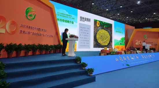 2021年第20屆廣西名特優(yōu)農(nóng)產(chǎn)品(廣州)交易會桂林副市長趙奇玲推介原心達金槐茶