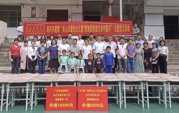自治區(qū)自然資源廳政策法規(guī)處、行政審批辦公室、地質(zhì)勘查管理處、廳直屬機關(guān)團委、廣西自然資源管理干部培訓(xùn)中心、廣西中國—東盟培訓(xùn)礦業(yè)人才交流培訓(xùn)中心到巴馬縣西山鄉(xiāng)弄峰村聯(lián)合開展“關(guān)心關(guān)愛婦女兒童 ?民族團結(jié)助力鄉(xiāng)村振興”主題系列活動,向平洞小學(xué)捐贈30套課桌椅、贈送一批法律書籍,給學(xué)校的女教師贈送大米、油和牛奶等慰問品,向34名留守兒童贈送牛奶、學(xué)習(xí)用具、玩具一批,與平洞小學(xué)的同學(xué)們分享黨史故事、開展防災(zāi)減災(zāi)知識科普、校園欺凌普法宣傳、互動搶答。通過一系列活動促進交往交流交融,不斷鑄牢中華民族共同體意識,改善少數(shù)民族地區(qū)學(xué)校學(xué)習(xí)環(huán)境,關(guān)愛師生,促進少數(shù)民族學(xué)生健康成長、全面成才,進一步鞏固脫貧攻堅成效,更好地推進鄉(xiāng)村振興戰(zhàn)略的有效銜接。