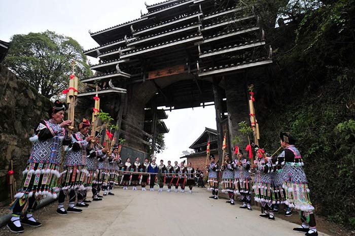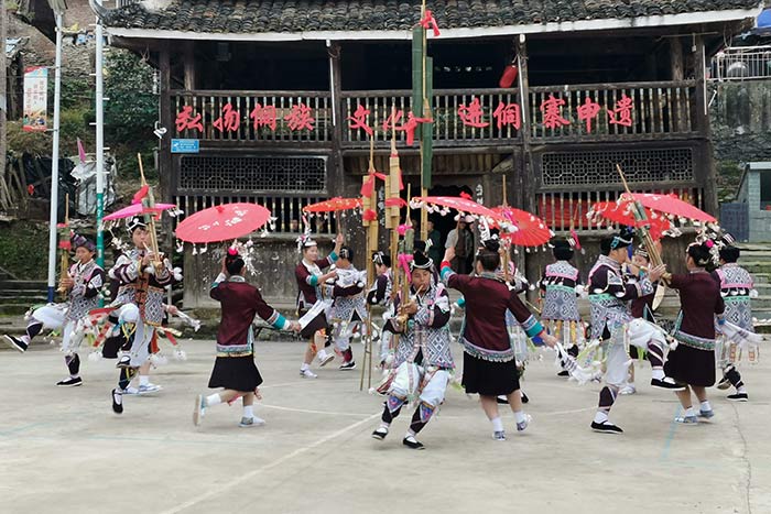 村民們正在表演蘆笙踩堂。三江縣委組織部供圖