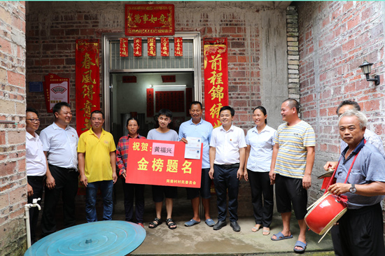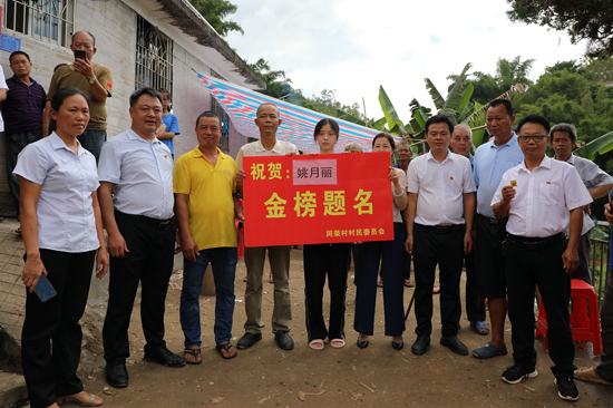 日前,在藤縣金雞鎮(zhèn)同榮村,鑼鼓喧天,龍騰獅舞,熱鬧異常。該村黨支部書記和駐村第一書記各提一個金榜題名的牌子,帶領(lǐng)著村干部以及舞龍隊、舞獅隊,先后來到黃福興、姚月麗家里,把金榜題名的牌子送到他們手中,同時,授予他們一枚學士星,并掛在家門口的“評星榜”上。