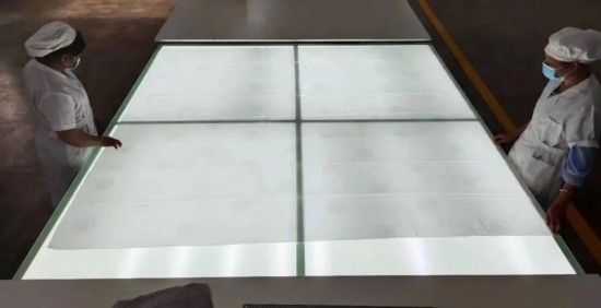 用于制作蠶絲被的包被面料,在制作前,工作人員會通燈光進行仔細檢查,確保面料無瑕疵。