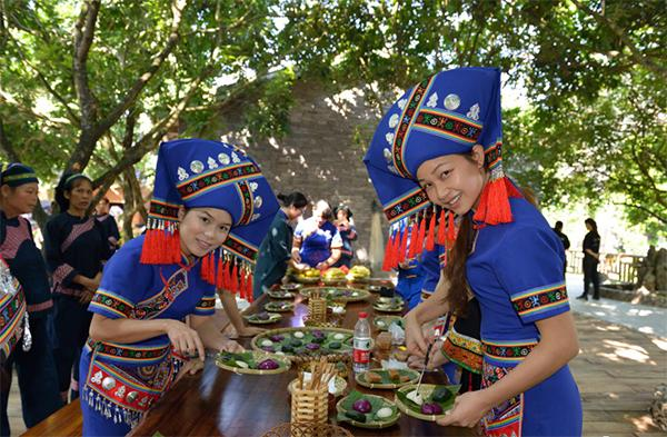 寧明縣城中鎮(zhèn)耀達(dá)村壯族姑娘在制作糍粑歡迎游客。黃文偉攝
