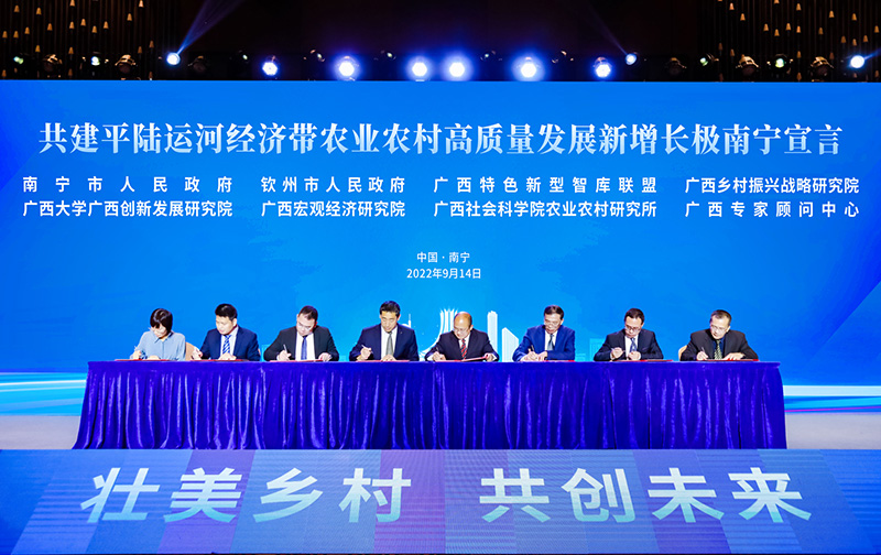 此外當天,南寧市人民政府、欽州市人民政府、廣西特色新型智庫聯(lián)盟、廣西鄉(xiāng)村振興戰(zhàn)略研究院、廣西大學(xué)廣西創(chuàng)新發(fā)展研究院、廣西宏觀經(jīng)濟研究院、廣西社會科學(xué)院農(nóng)業(yè)農(nóng)村研究所、廣西專家顧問中心8家單位共同簽署《共建平陸運河經(jīng)濟帶農(nóng)業(yè)農(nóng)村高質(zhì)量發(fā)展新增長極南寧宣言》,旨在通過共建平陸運河經(jīng)濟帶農(nóng)業(yè)農(nóng)村高質(zhì)量發(fā)展新增長極,共拓發(fā)展空間,共添增長動力,共促鄉(xiāng)村振興,共創(chuàng)美好未來。